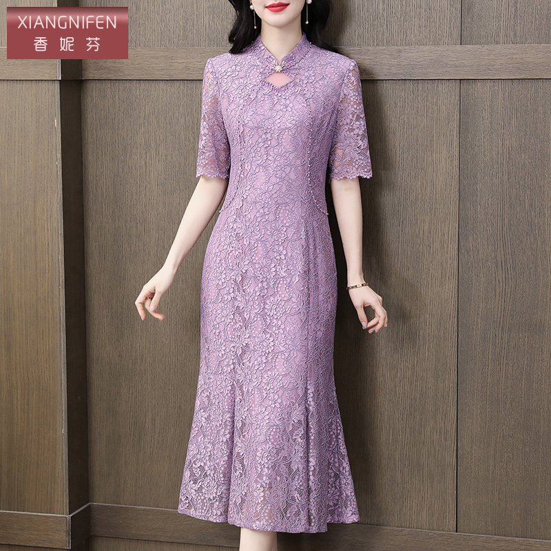 香妮芬2025夏季新款中年妈妈蕾丝连衣裙中长款婚庆喜庆旗袍礼服