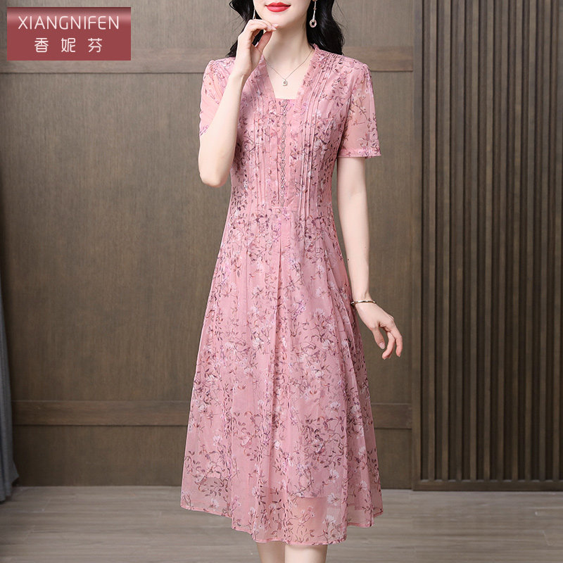 香妮芬洋气v领中年妈妈连衣裙女装2025新款夏季收腰显瘦通勤裙子