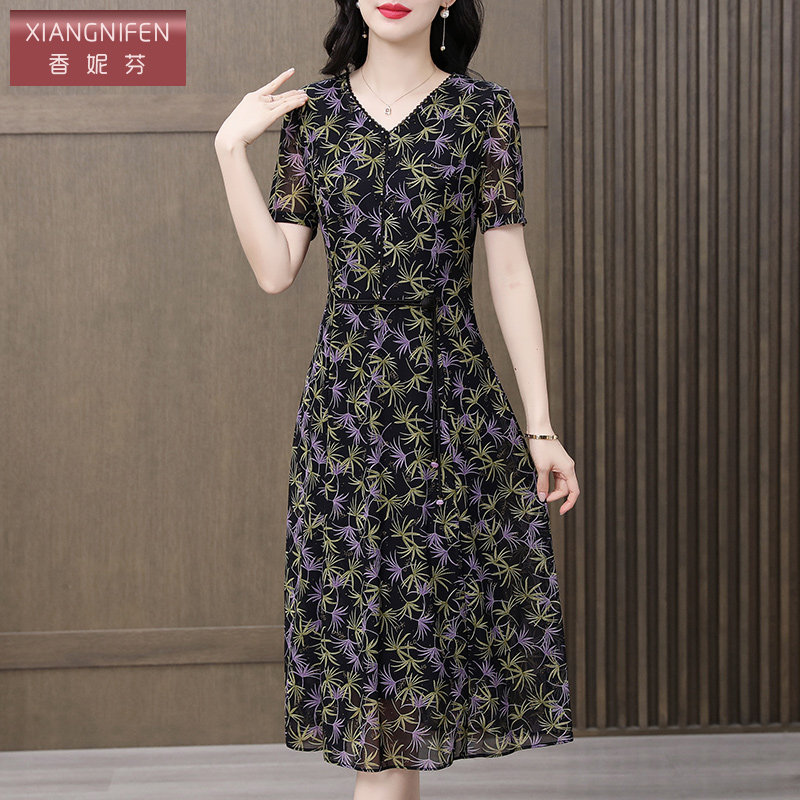香妮芬短袖新款中年妈妈连衣裙2025夏季台湾纱修身长款裙子大码女