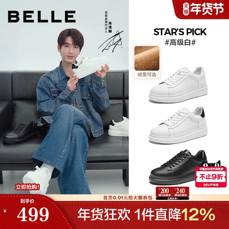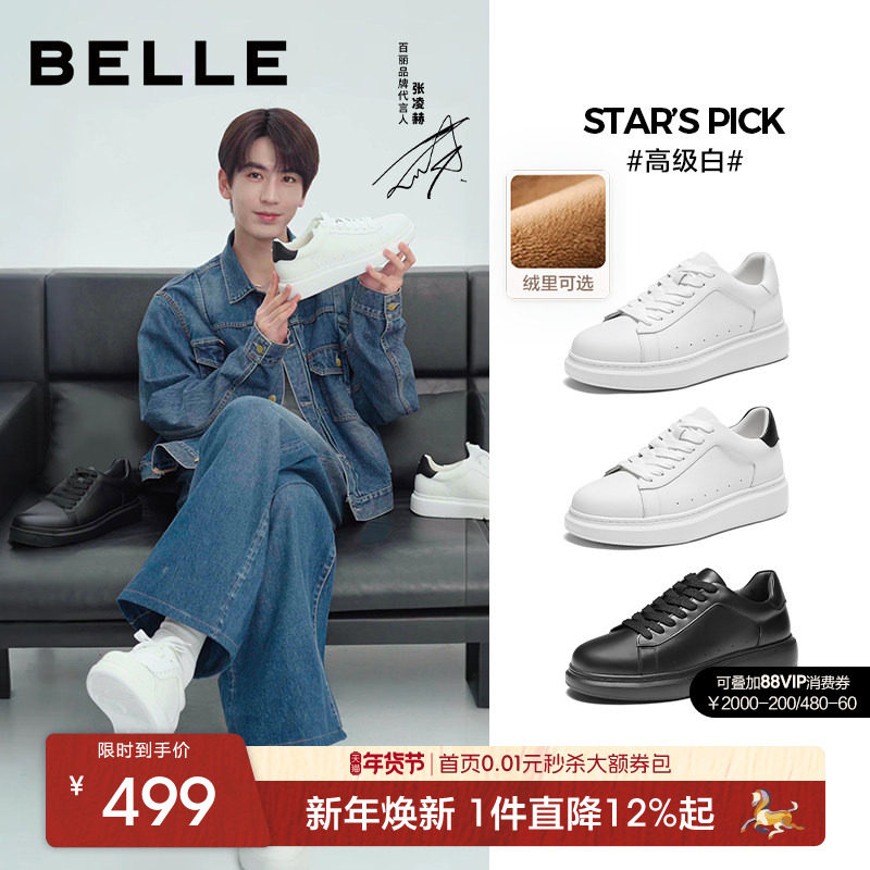 增高6cm张凌赫款百丽男鞋高级白厚底真牛皮加绒保暖小白板鞋男士