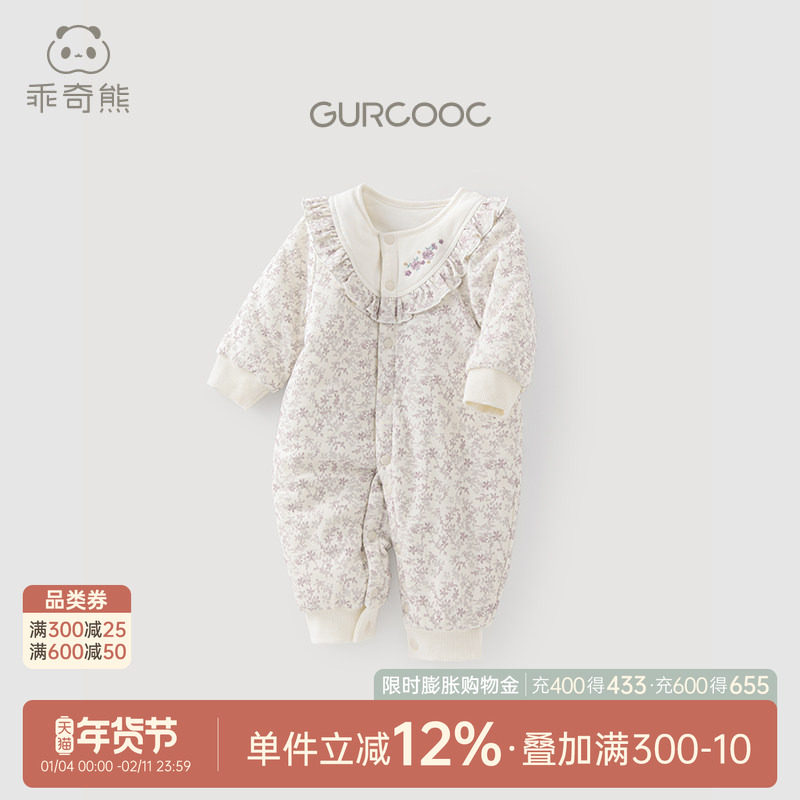 乖奇熊女宝宝夹棉连体衣冬季保暖加厚棉服婴幼儿公主碎花哈衣爬服