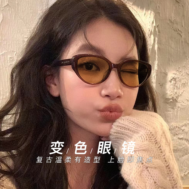 猫眼变色近视眼镜女款可配度数防蓝光辐射超轻自动感光显瘦眼睛架