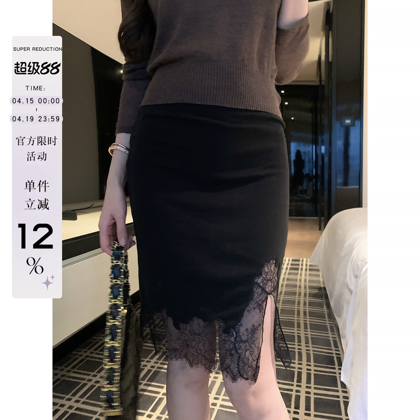 yuyuel 黑色含羊毛蕾丝开叉半身裙女春季纯欲气质包臀短款裙子