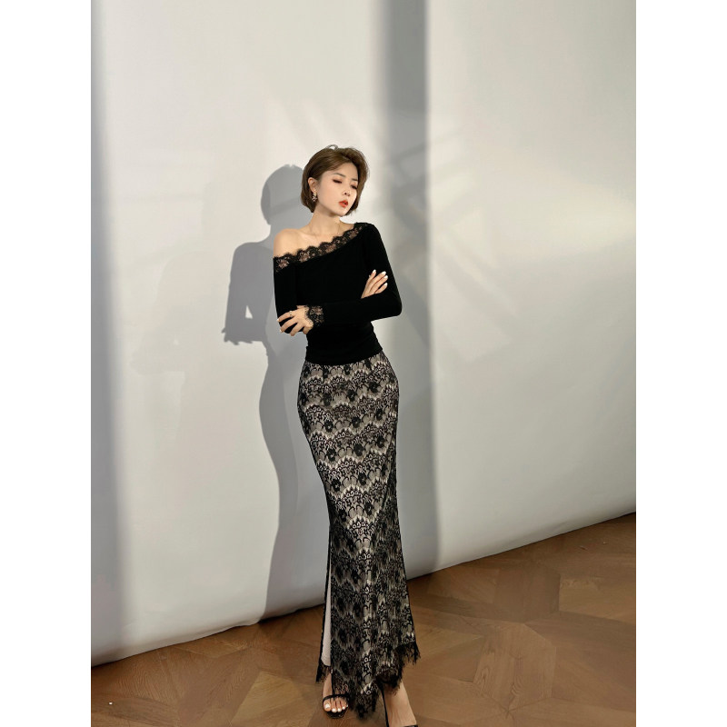 PynkiSwear 黑色/淡黄色低腰A字拼蕾丝花边开衩包臀半身裙长裙