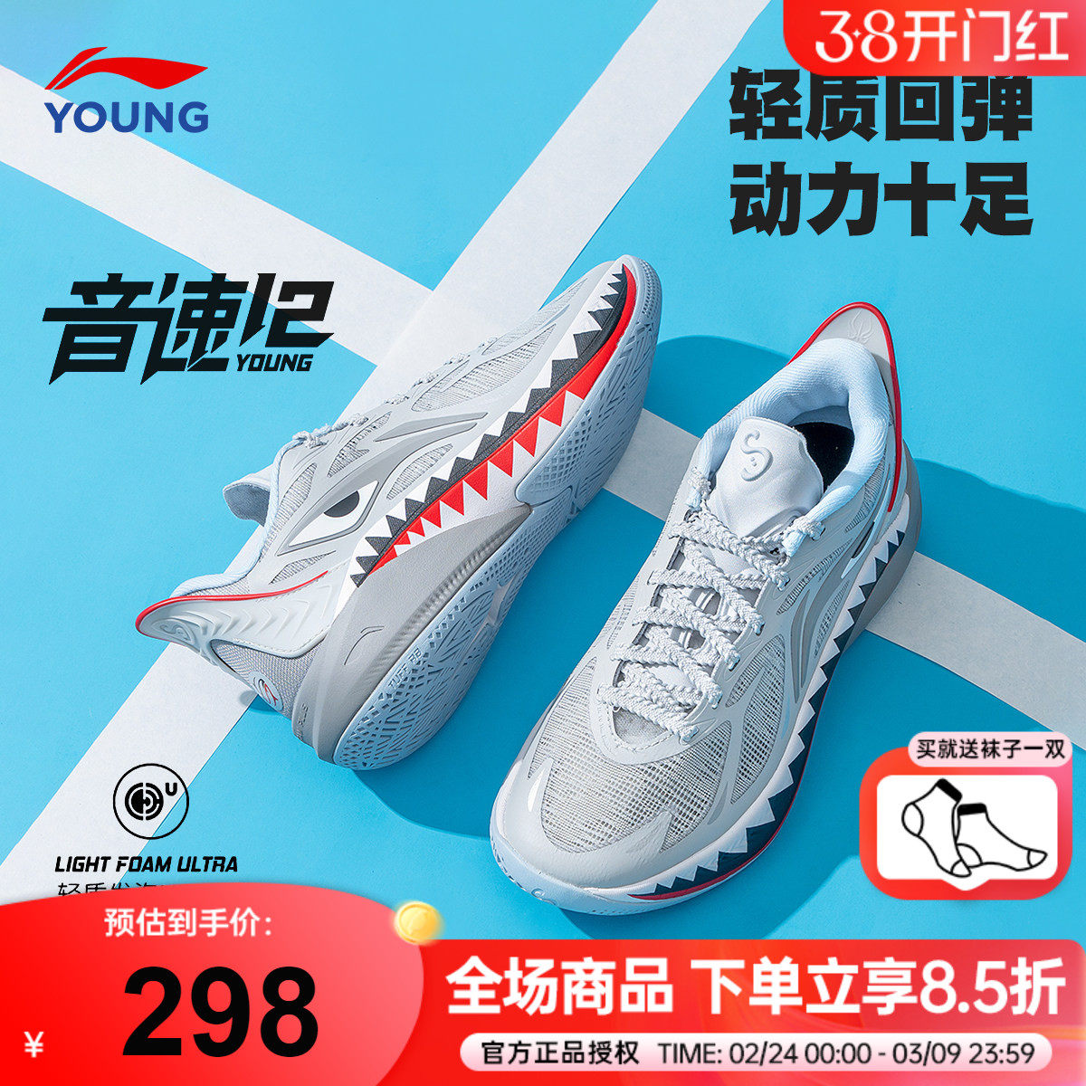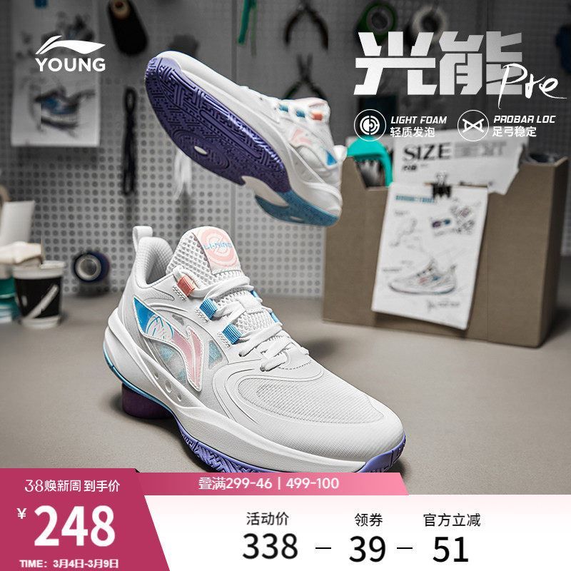 李宁童鞋篮球鞋男女大童款光能Pre回弹圆头青少年抗菌低帮运动鞋