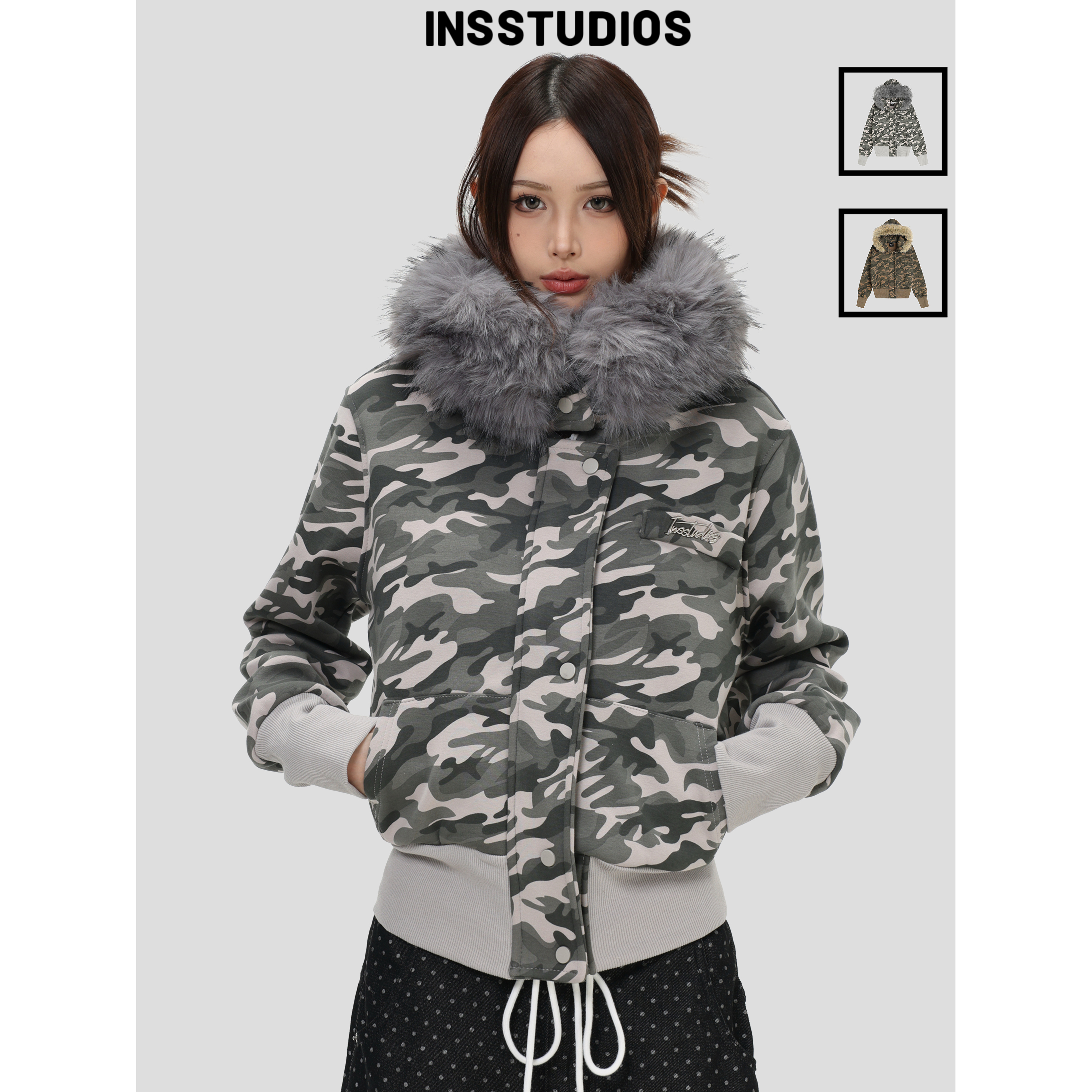 INSstudios 国潮美式「收腰大毛领迷彩连帽卫衣」短款开衫外套女