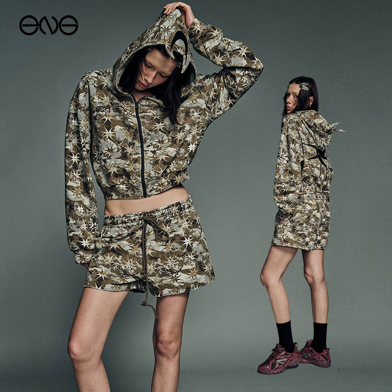 OV原创美式迷彩加宽螺纹宽松连帽卫衣女春季短款收腰显瘦开衫外套