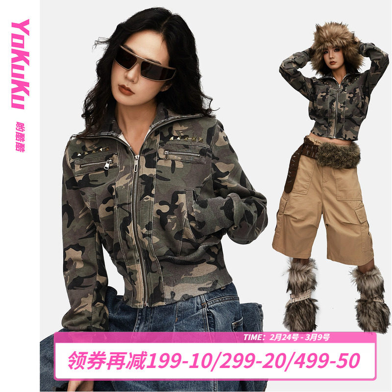 哟酷酷(麻辣女兵)秋冬季洗水迷彩上衣女铆钉短款收腰显瘦外套女