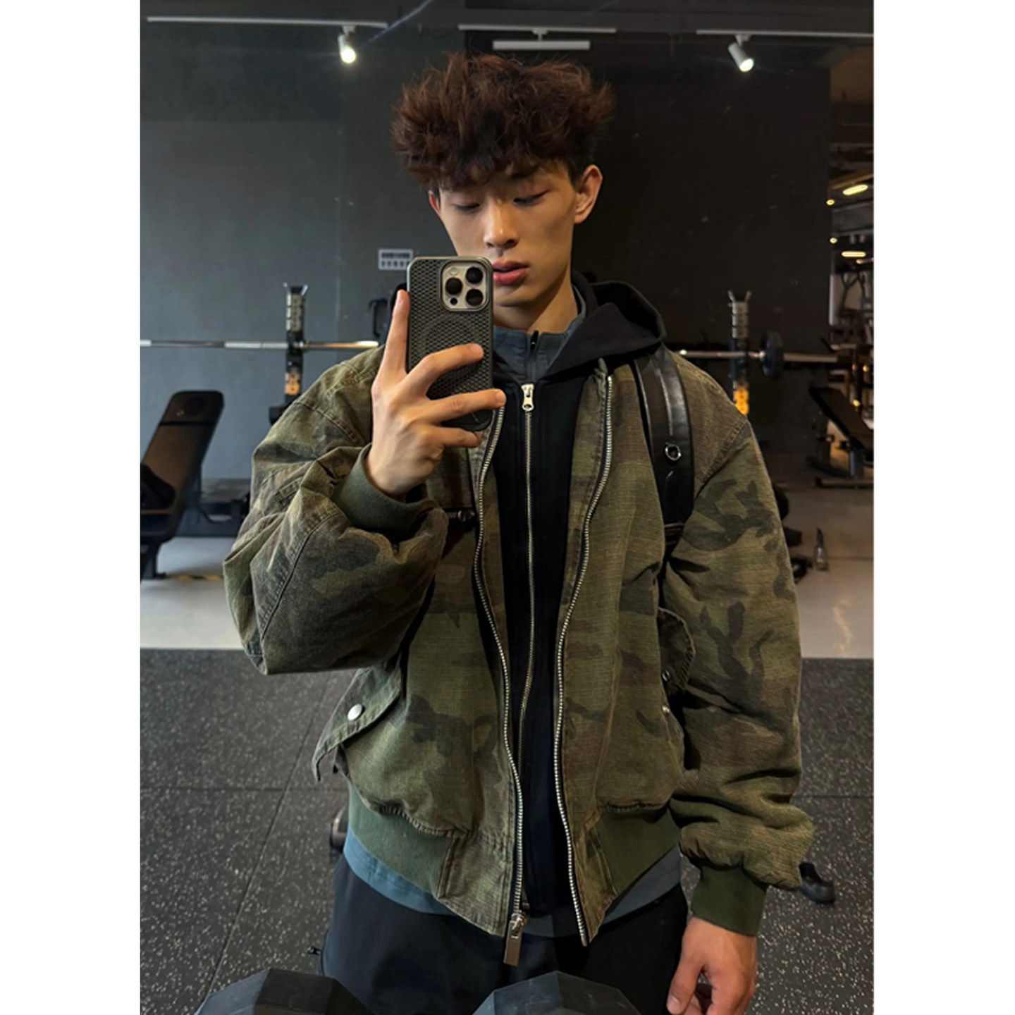 SUN90 美式复古宽松迷彩帽衫短外套女情侣款慵懒开衫拉链连帽卫衣