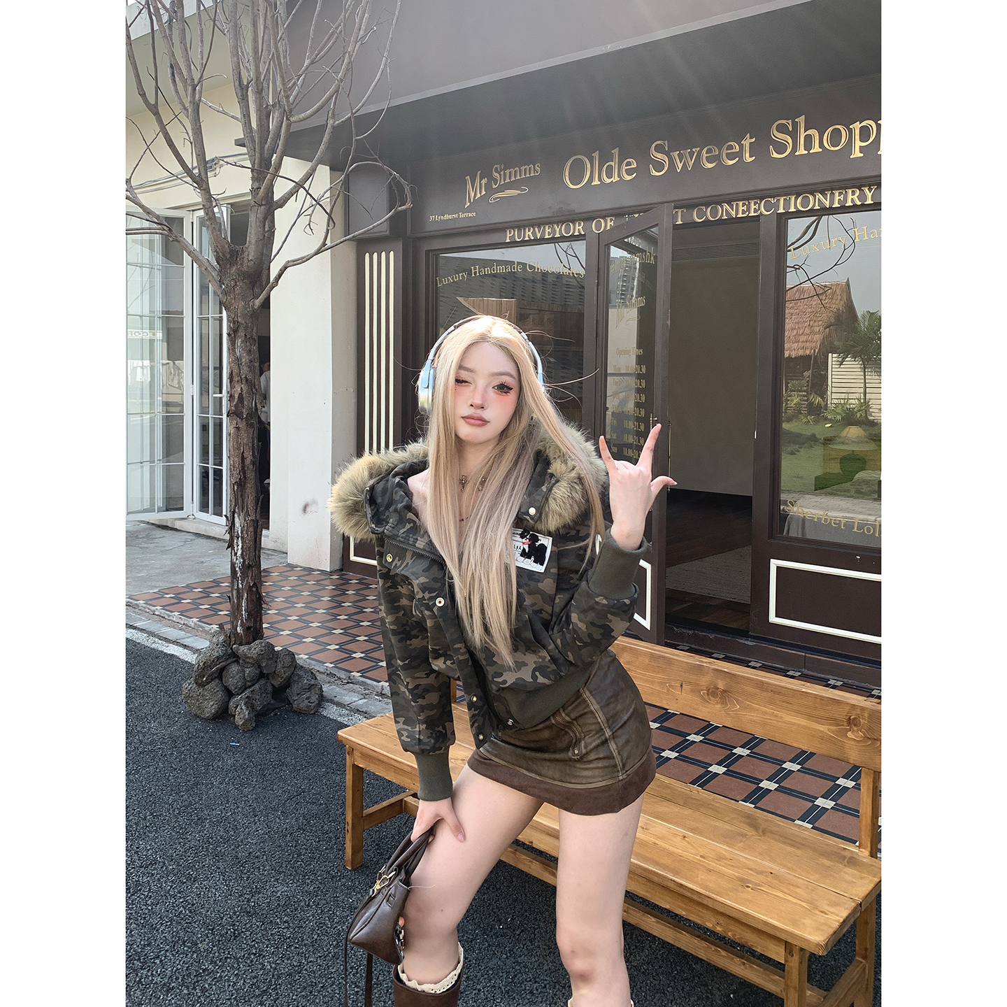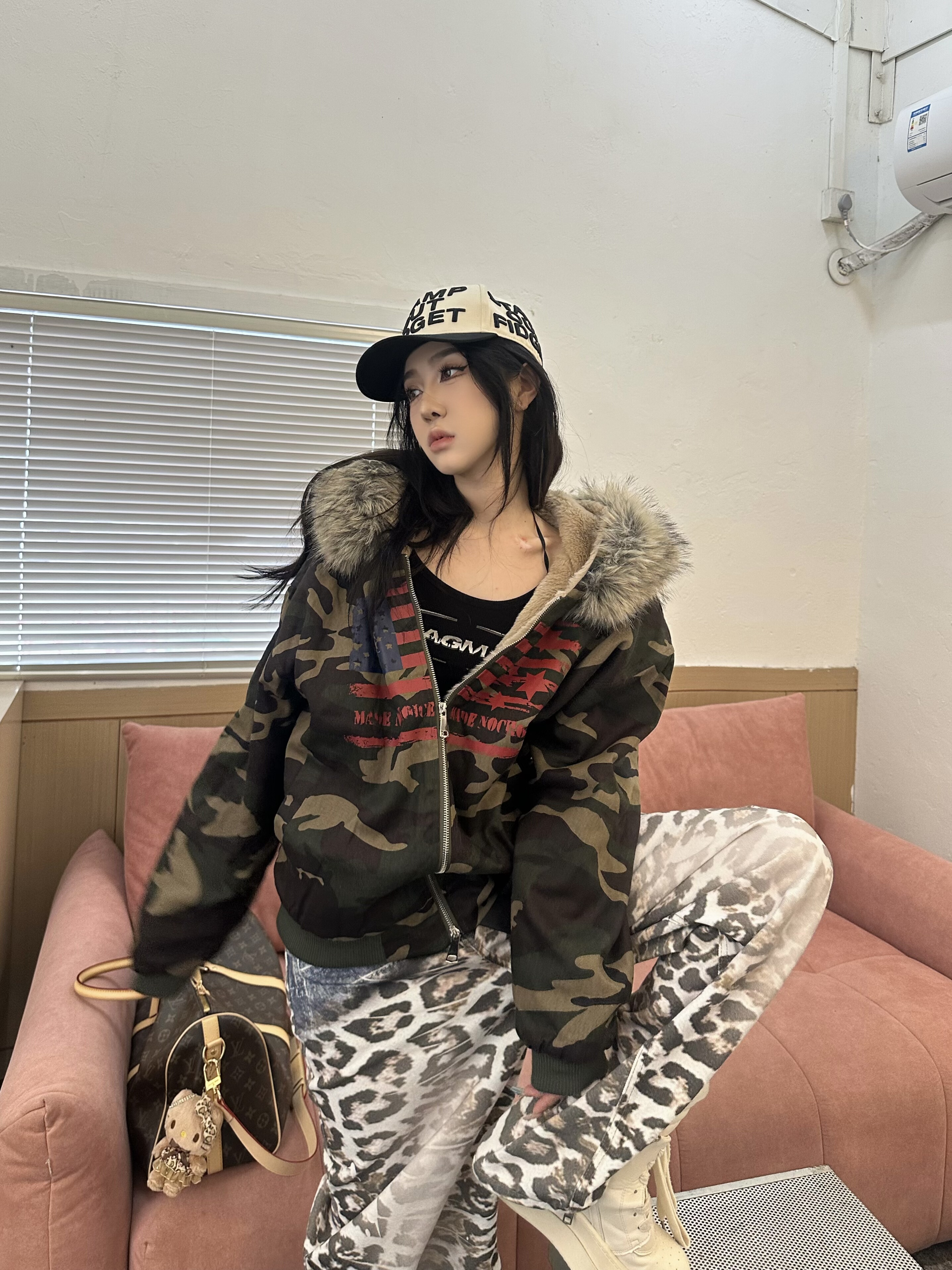 Feel lonely 毛领迷彩宽松连帽外套女美式复古风辣妹修身短款开衫