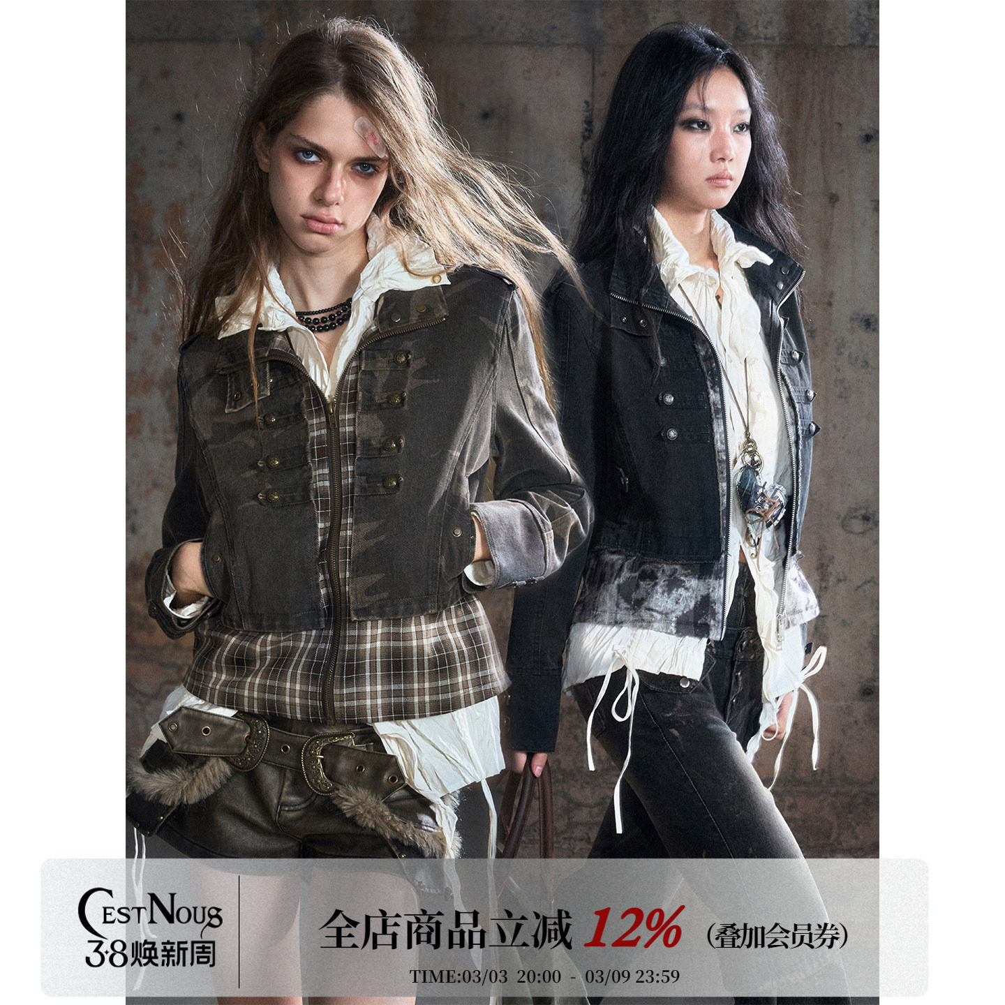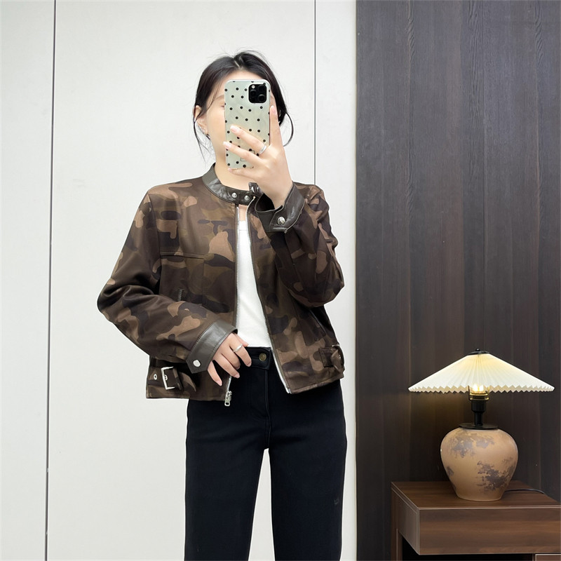 CestNous立领拉链正肩夹克外套女秋季百搭水洗做旧拼接迷彩短上衣
