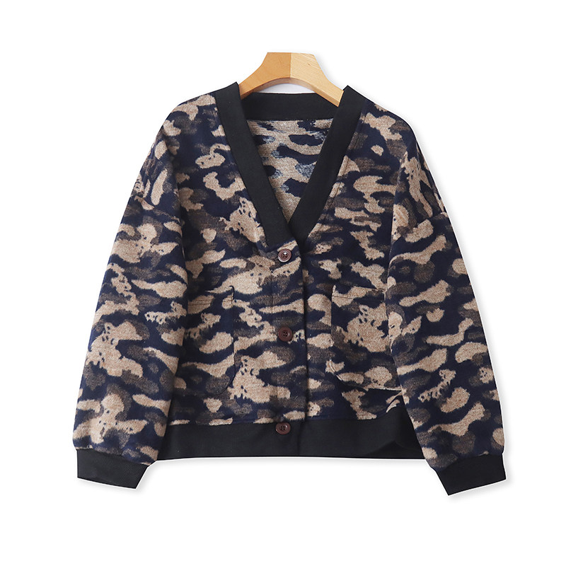 外贸慵懒V领迷彩外套 春秋新款时尚宽松开衫女长袖短款上衣 13071