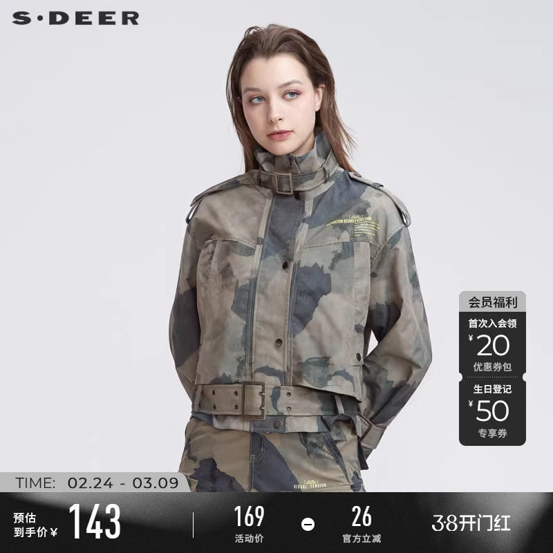 sdeer圣迪奥女春装立领撞色字母迷彩收腰短款外套S22182222