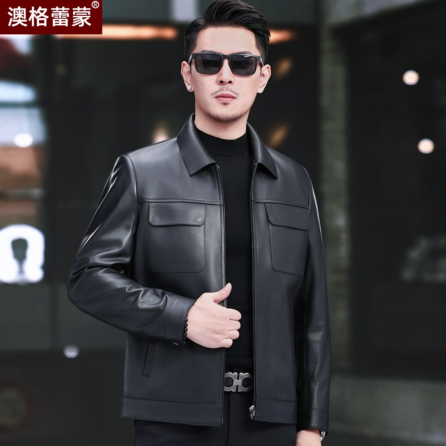 - 男翻领真皮皮夹克