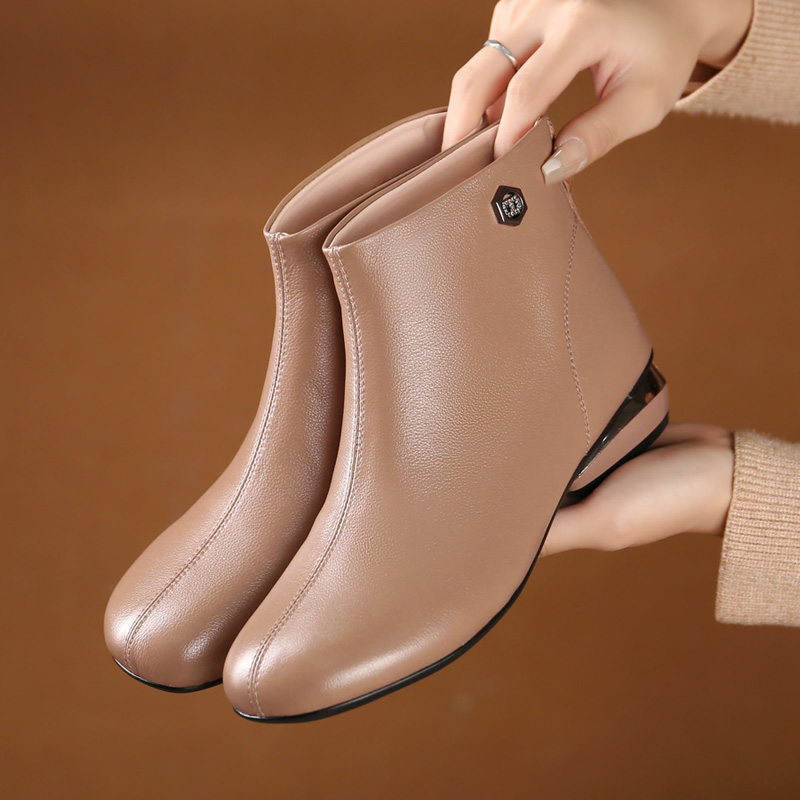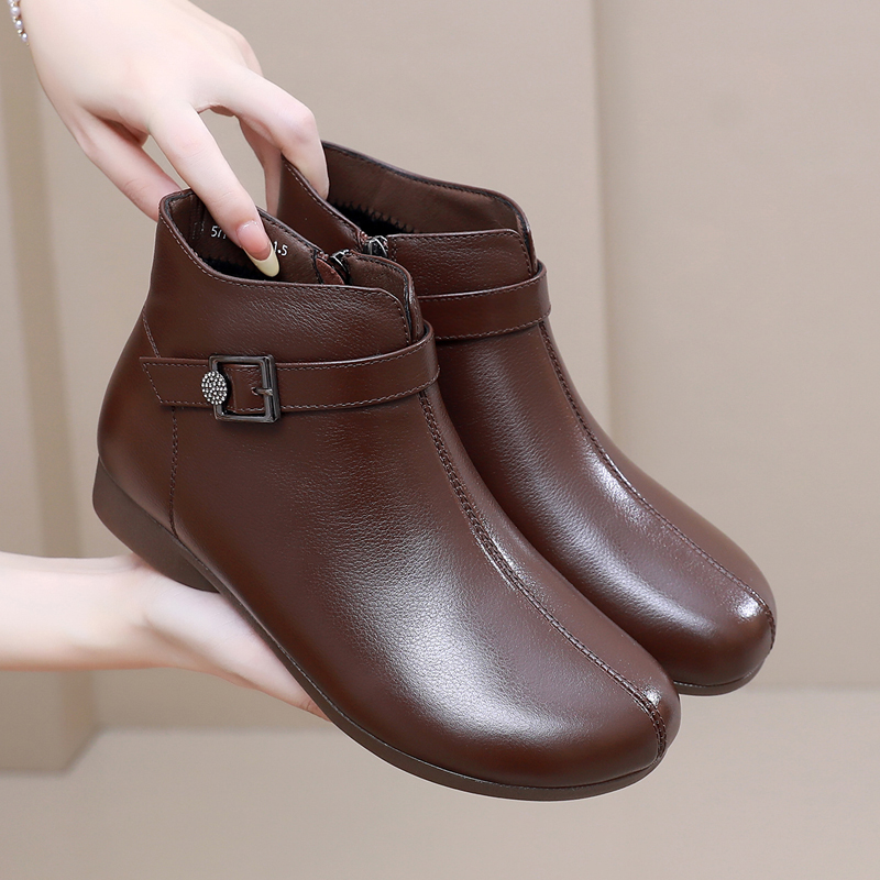 真皮牛皮短靴女加绒棉鞋妈妈靴子春秋单靴低跟平底防滑中老年女靴
