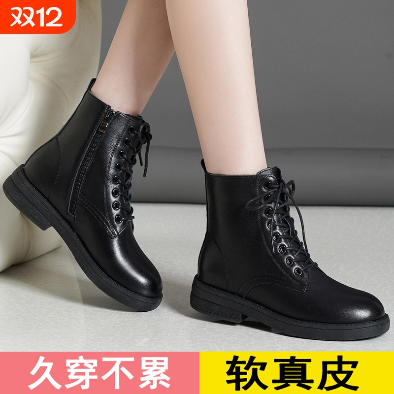 马丁靴女鞋平底小短靴春秋单靴软底软皮冬季加绒棉鞋真皮牛皮黑色