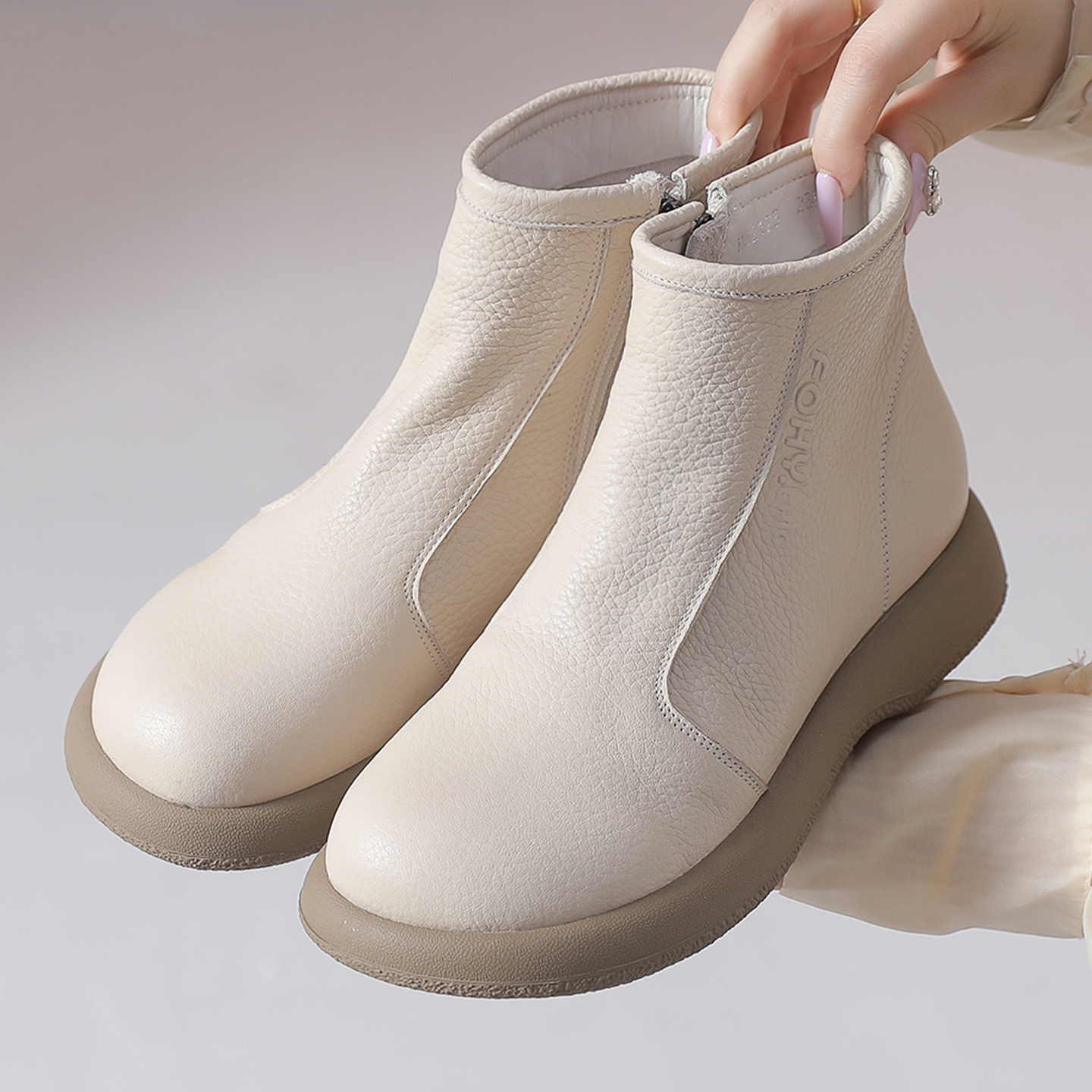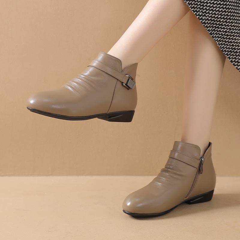 真皮平底短靴春秋短筒单靴软底大码低跟女靴百搭保暖加绒妈妈棉鞋