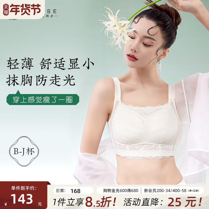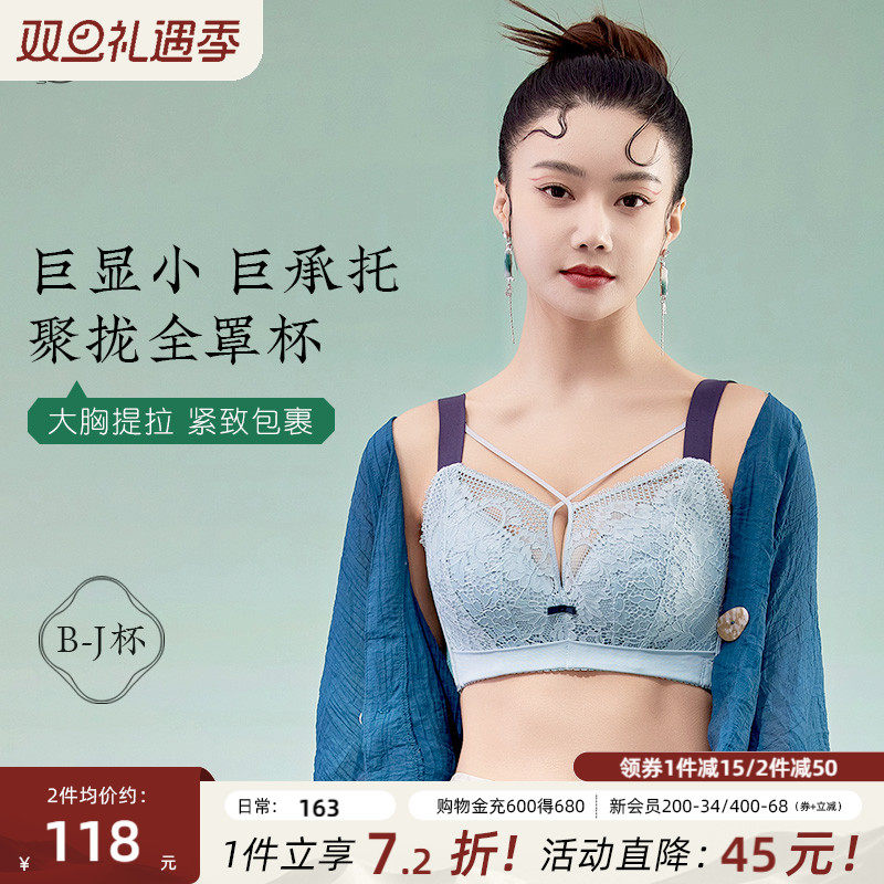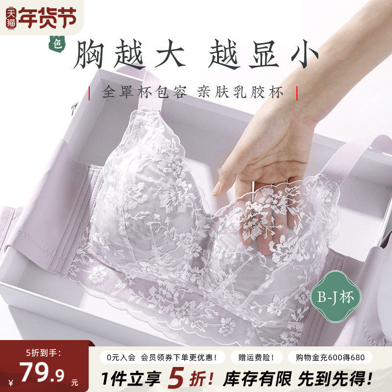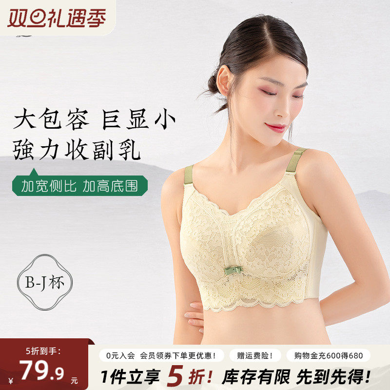 月色大胸显小内衣女全罩杯胖mm收副乳防下垂抹胸式蕾丝大码文胸罩