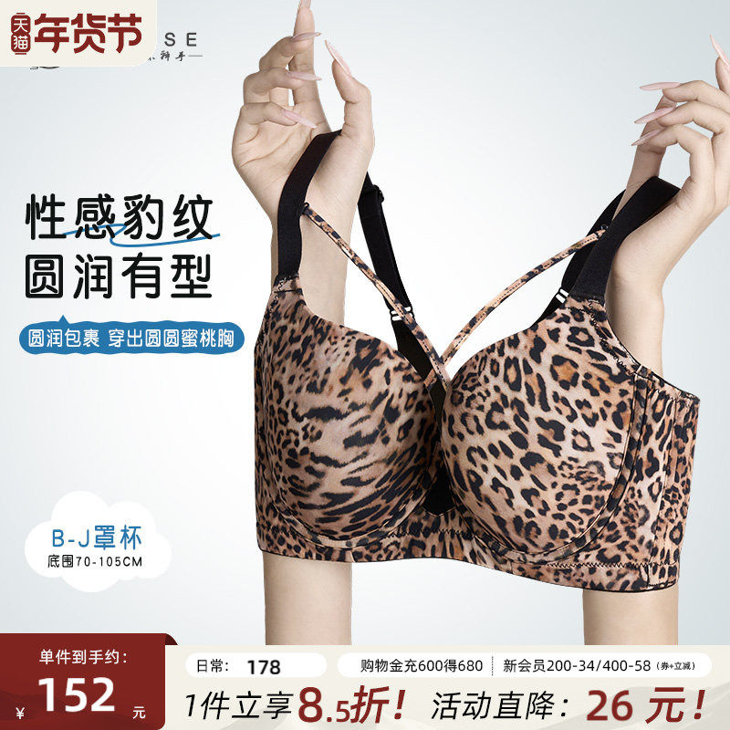 月色豹纹无痕大胸内衣女大胸显小薄款胖mm聚拢收副乳防垂大码文胸