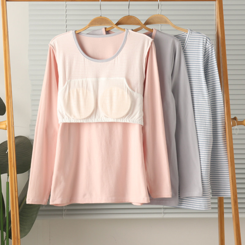 外贸女士纯棉弹力带胸垫BRA免文胸长袖家居服睡衣上衣T恤打底衫秋