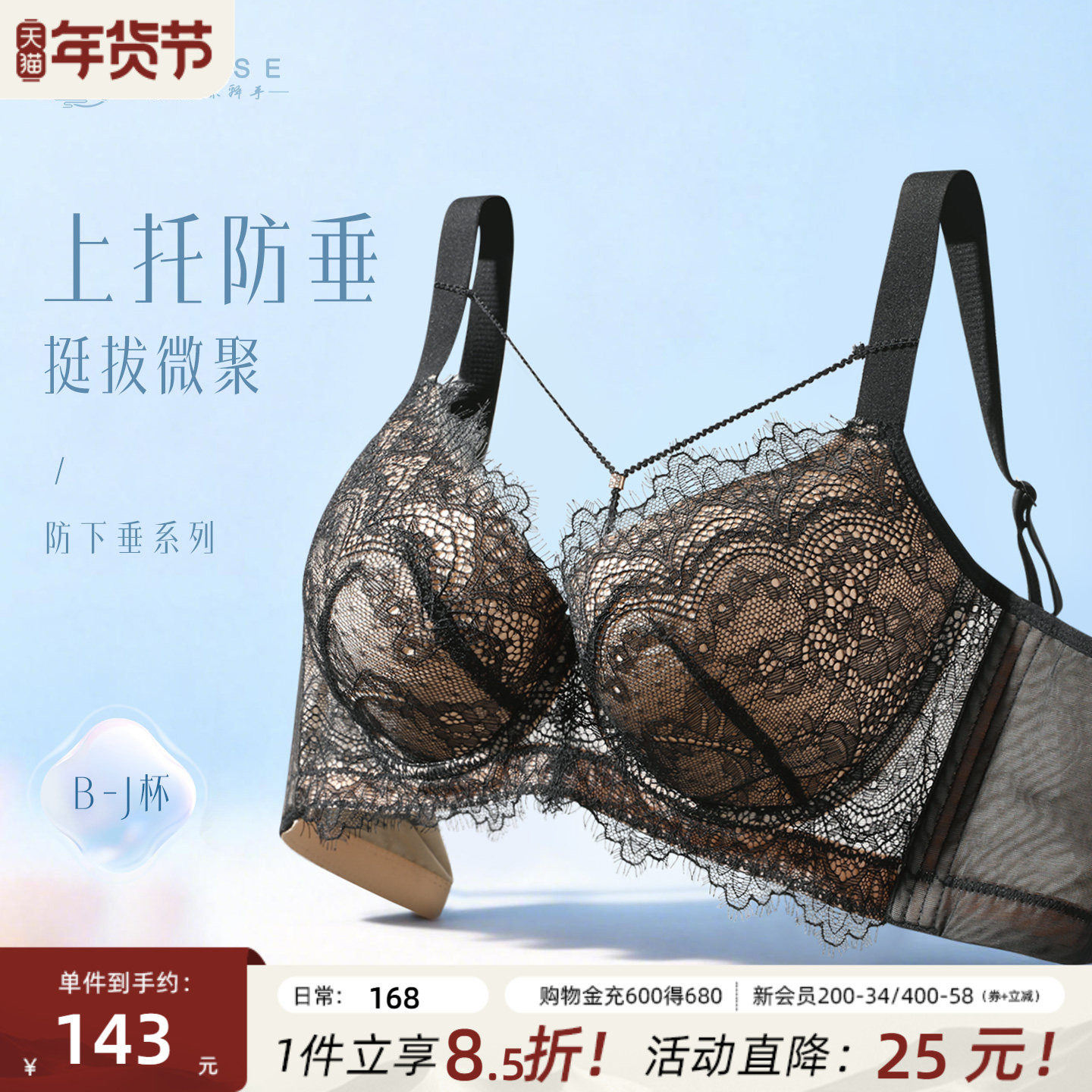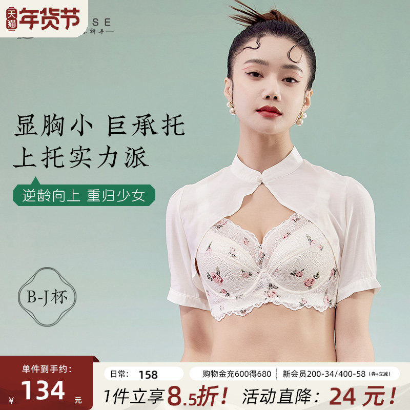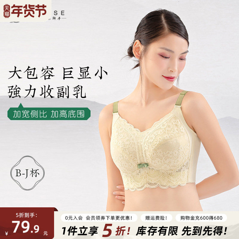 月色大码内衣女大胸显小胸聚拢上托防下垂蕾丝收副乳美胸塑形文胸