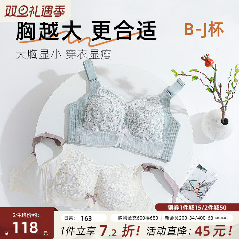 月色大胸内衣女薄款大胸显小胸防下垂收副乳胖mm睫毛蕾丝大码文胸