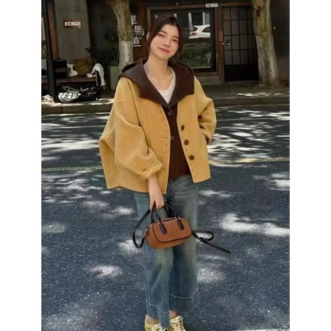 高级感灰咖色毛呢外套女短款秋冬新款韩版小个子宽松连帽呢子大衣