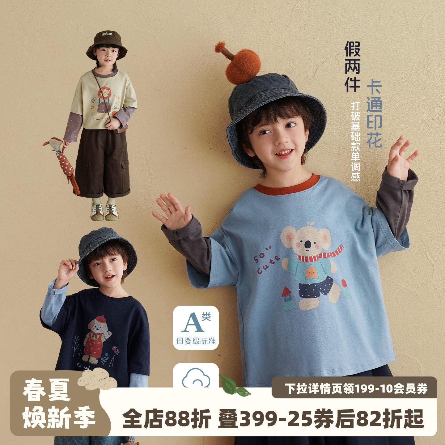 砚台家男童纯棉A类假两件T恤春季童装男宝宝长袖上衣早春儿童体恤