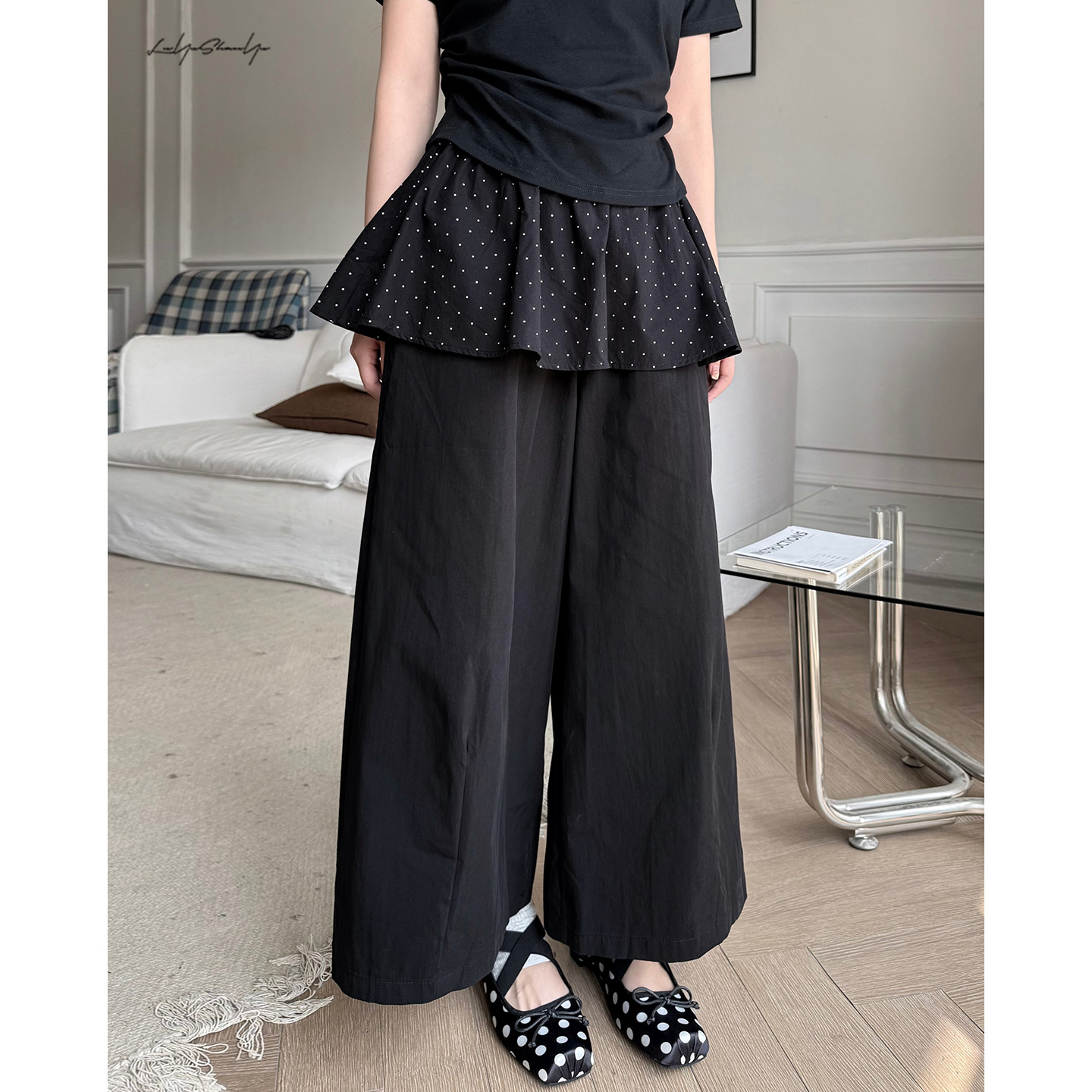 陆与山屿【砚物】波点屁帘荷叶边假两件直筒阔腿休闲裤黑色长裤子