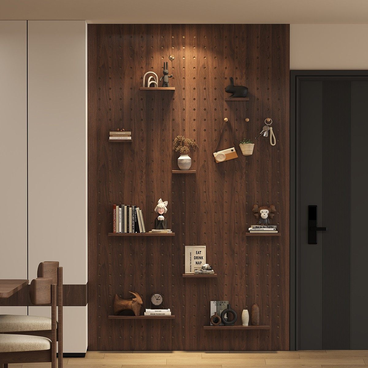 实木洞洞板置物架入户玄关墙面墙上造型墙木质挂板收纳挂衣架定制
