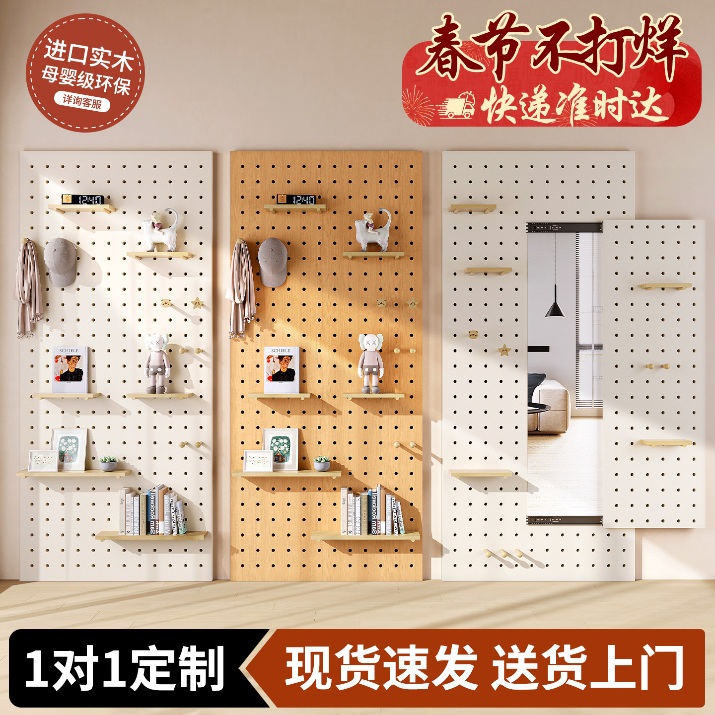 实木洞洞板定制玄关墙面置物架墙上挂板入户隔板收纳架隐形穿衣镜