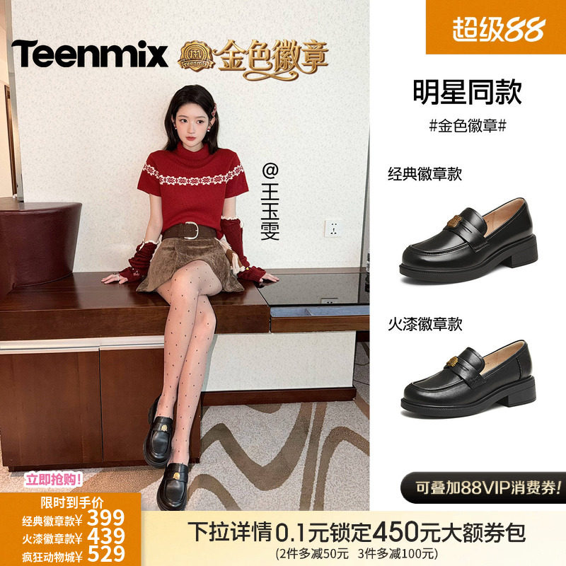 孔雪儿同款天美意金色徽章常青藤乐福鞋厚底单鞋女新款黑色小皮鞋