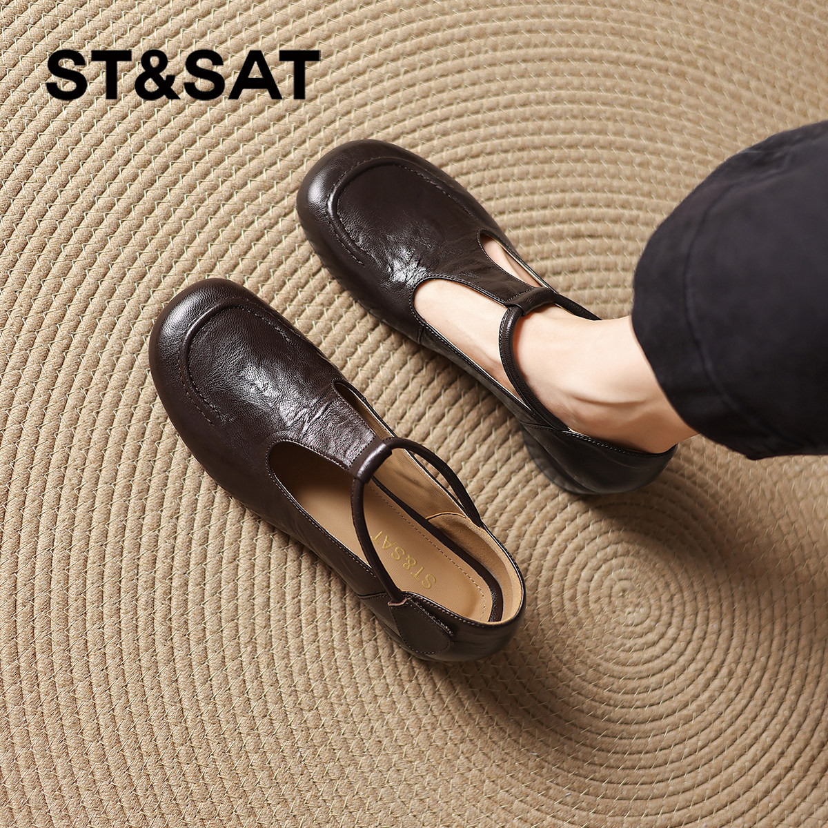 星期六羊皮单鞋女款2025新款秋季棕色玛丽珍女鞋粗跟豆豆鞋小皮鞋