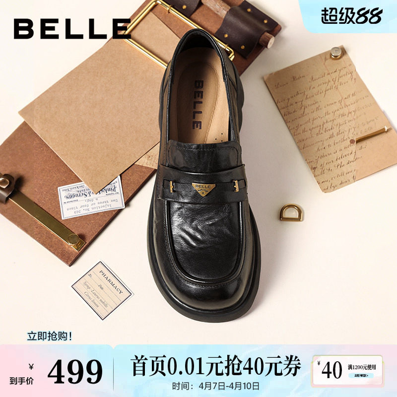 百丽元宝乐福鞋女26新款复古英伦风羊皮黑色小皮鞋深口单鞋E9L1DA