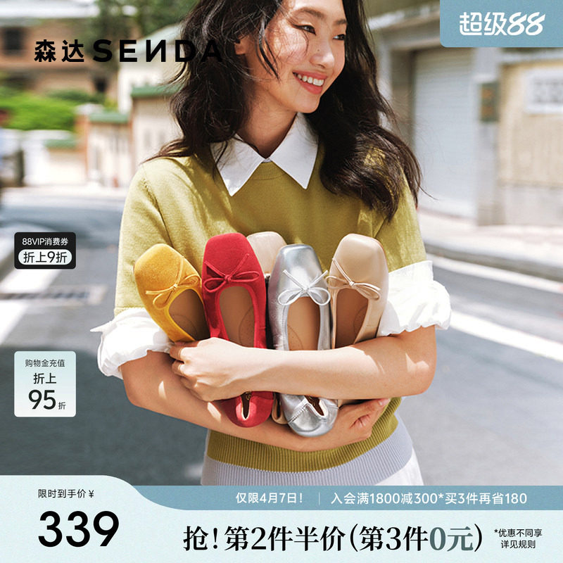 森达羊皮蛋卷鞋女银色皮鞋平底鞋浅口芭蕾鞋红色玛丽珍法式单鞋女