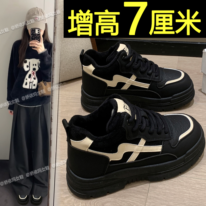 黑色高帮鞋子女2025新款秋冬季加绒保暖厚底休闲鞋内增高运动板鞋
