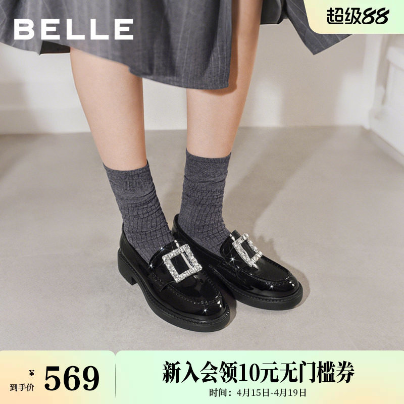 百丽璀璨乐福鞋厚底新款女鞋真皮方扣闪钻黑色小皮单鞋B3085AM6