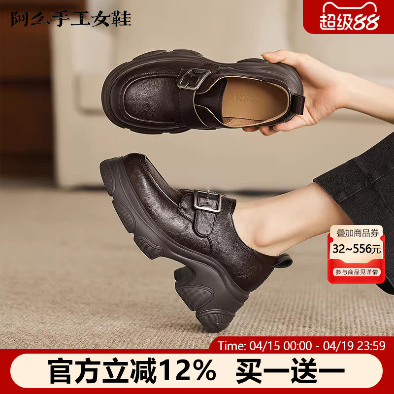 阿么手工女鞋厚底英伦风真皮气质粗跟乐福鞋时尚百搭圆头单鞋新款