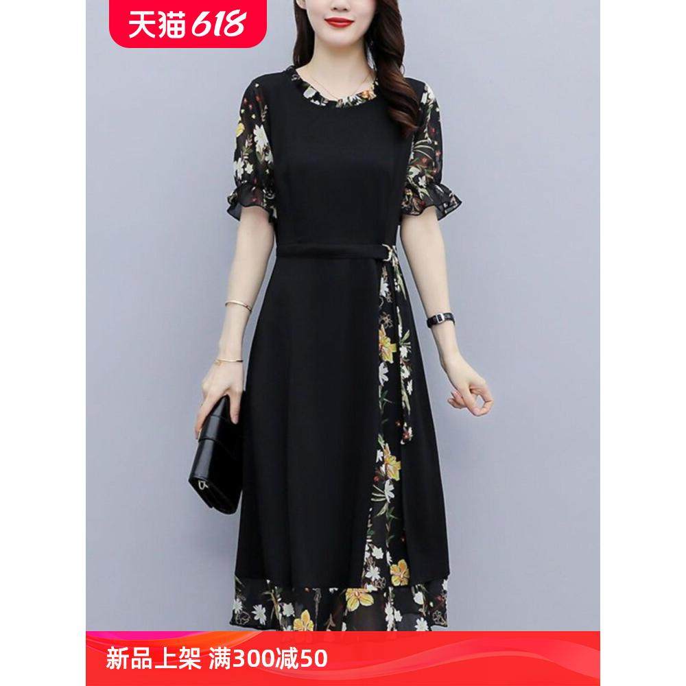 竹依依黑色V领碎花连衣裙女夏修身显瘦雪纺印花高腰短袖长款裙子