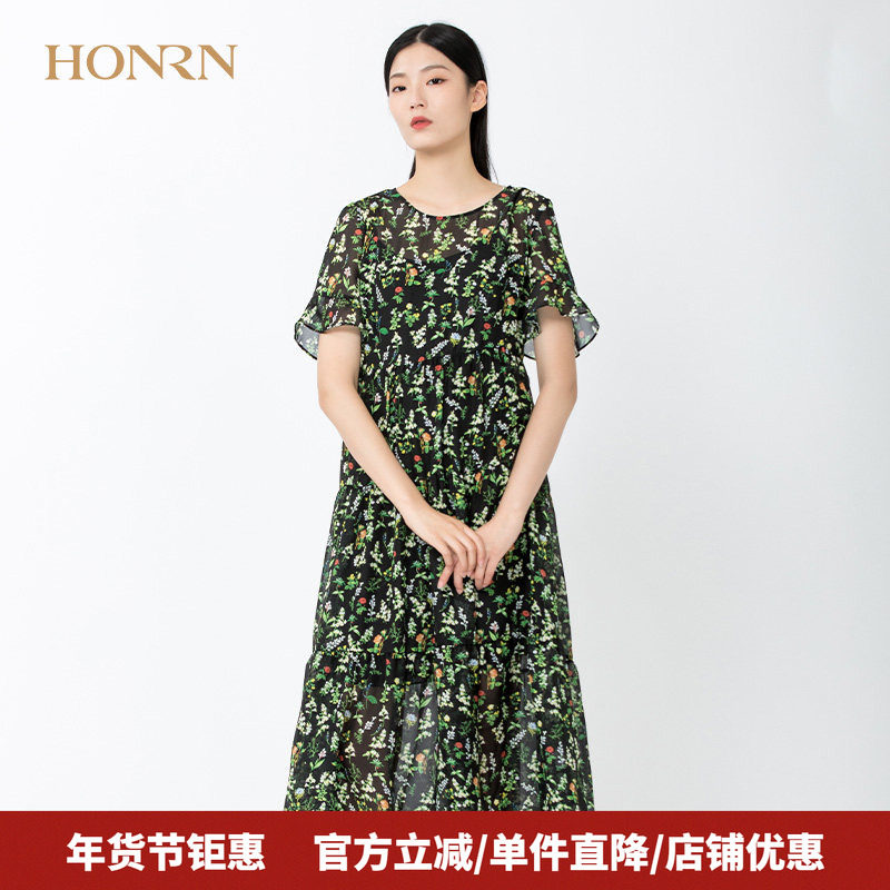 HONRN/红人气质修身显瘦长袖v领雪纺印花收腰a字连衣裙女春秋款