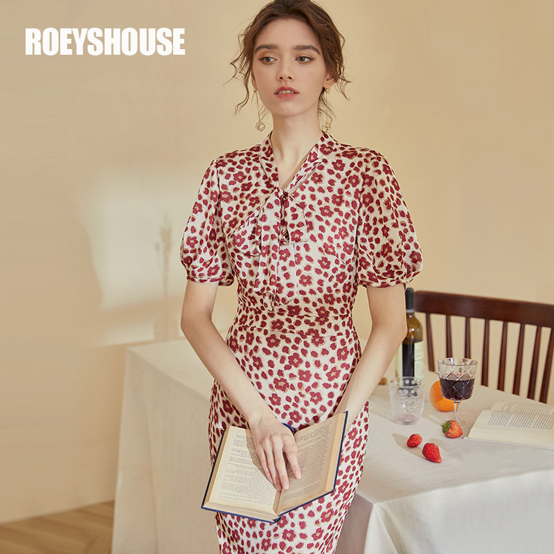 罗衣复古印花雪纺连衣裙女2024夏装新款法式修身泡泡袖裙子01831