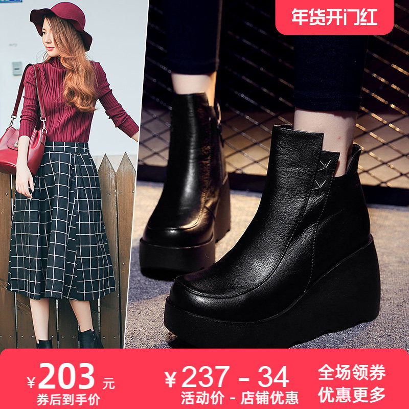 秋冬季女鞋厚底坡跟短靴女真皮鞋子圆头加绒休闲舒适增高跟女靴子