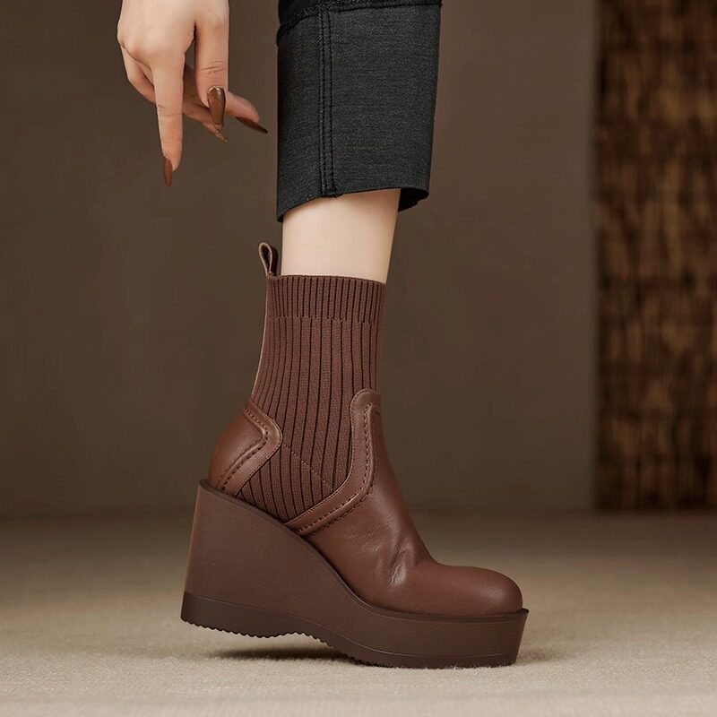 小个子坡跟小短靴女真皮厚底显瘦针织袜靴2025秋不累脚瘦瘦弹力靴