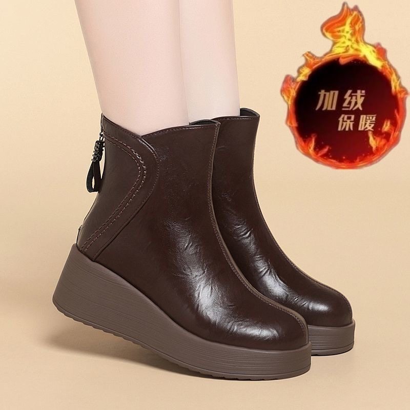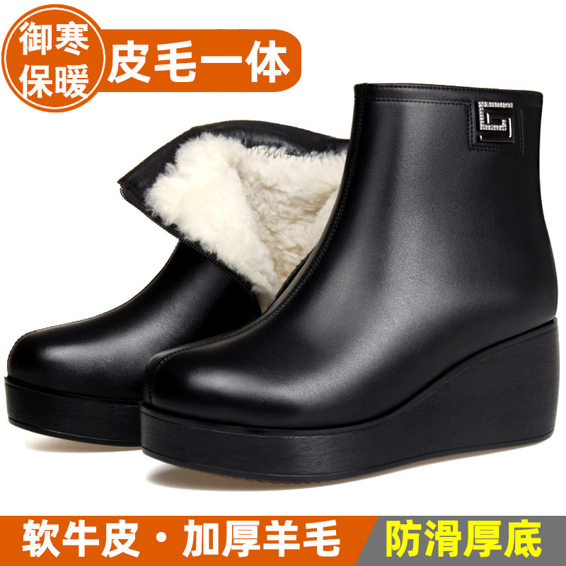 坡跟厚底短靴女冬季高跟妈妈靴子加绒加厚雪地靴防滑真皮羊毛皮鞋