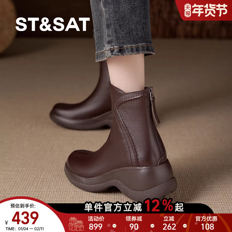 星期六2025冬季防滑厚底短靴女坡跟真皮棕色小个子加绒牛皮马丁靴