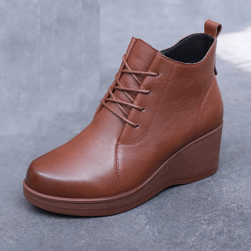 羊皮坡跟短靴女单靴真皮秋冬软底厚底高跟靴子防滑加绒妈妈棉皮鞋