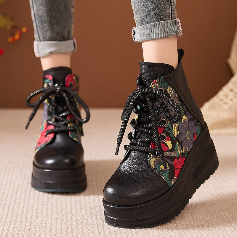 民族风厚底坡跟短靴女真皮复古印花小个子高帮皮靴增高冬鞋大棉靴