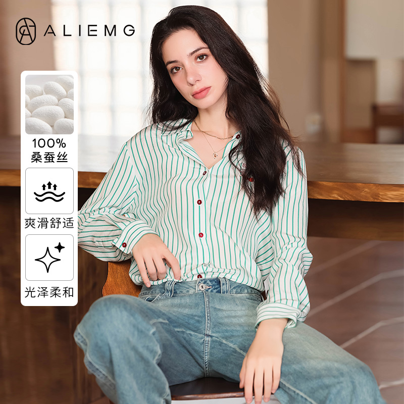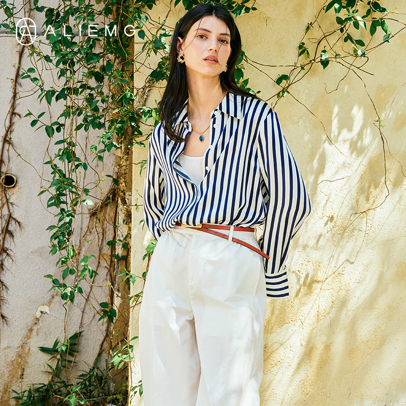 桑蚕丝上衣女2025早秋新款蓝白条纹法式休闲衬衫时尚通勤真丝衬衣