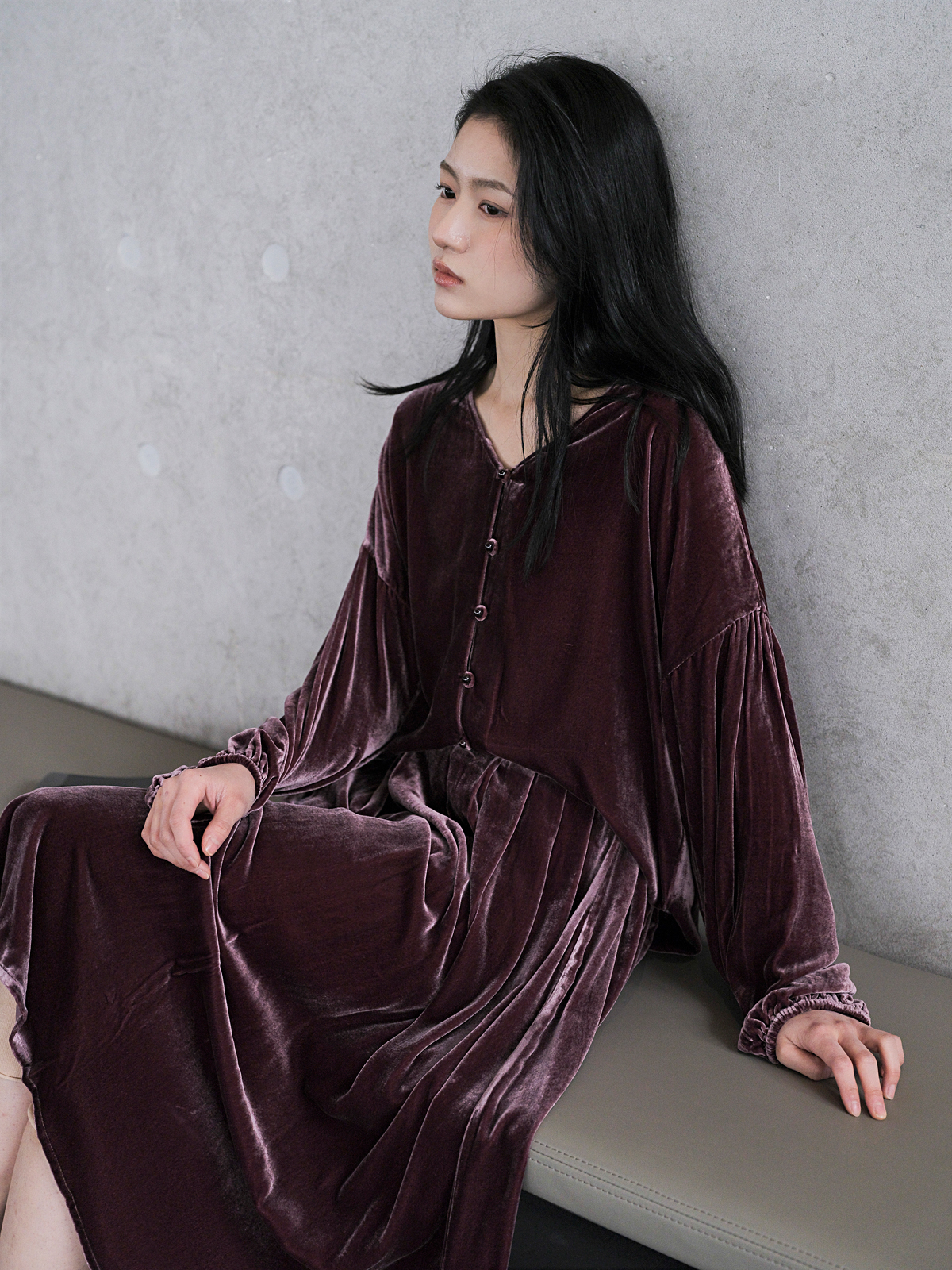原隐秋初高端套装V领长袖T恤珠泡泡袖宽松休闲真丝丝绒衬衫上衣女