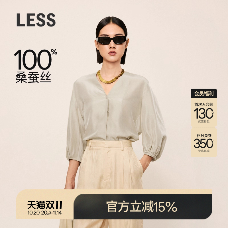 LESS衬衫女桑蚕真丝宽松休闲灯笼袖简约垂感V领衬衣上衣2O621395H